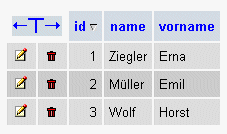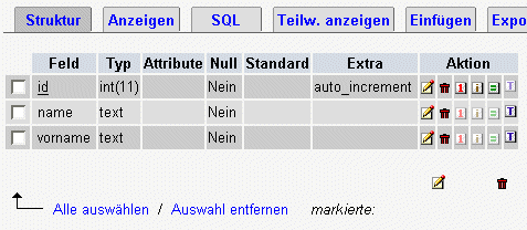 Man sieht, dass die Felder Variablen mit einem bestimmten Datentyp sind. Im Beispiel ist das Feld id vom Typ int, int steht für integer (ganze Zahl). Die Felder name und vorname sind vom Datentyp text.