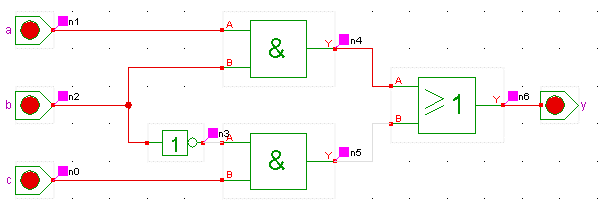Stelle zu obiger Schaltung den Term auf. Welche Werte nimmt y für a = c = 1 an?
