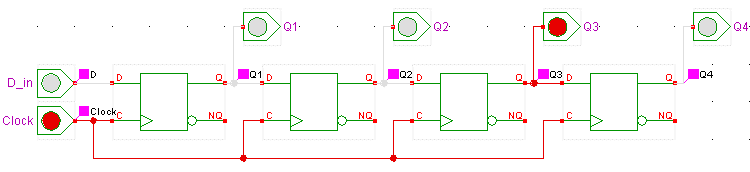 Folgendes Schieberegister ist aus vorderflankengetriggerten MS-FFs (Hades: metastabiles DFF) aufgebaut.
