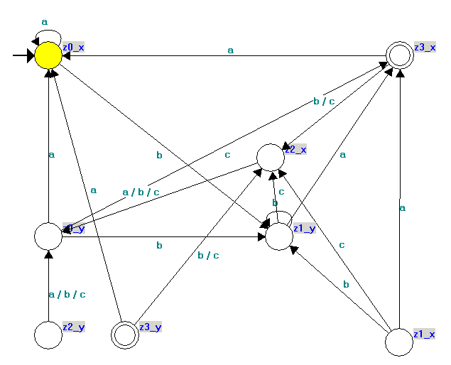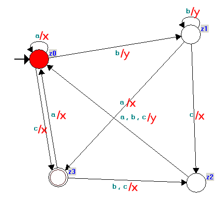 Man sieht, dass die Zustände z1_x, z2_y und z3_y theoretisch nie erreicht werden. Sie können eigentlich weggelassen werden. In der Technik wird man für ein fehlerhaftes Hineingeraten ein systemgerechtes Weiterarbeiten vorsehen.