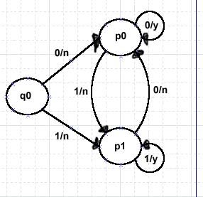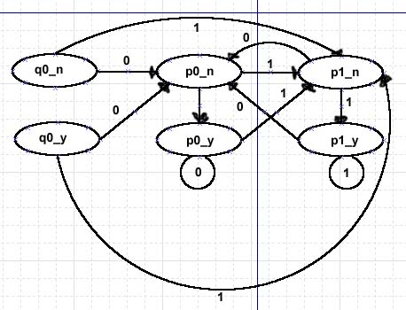 Hier sehen wir einen typischen Mealy-Automaten. Seine (für unser Thema eigentlich unwichtige) Aufgabe: Prüfen, ob die zwei zuletzt eingegebenen Ausgaben gleich waren, je nach Ergebniss soll er ein Y oder ein N ausgeben (yes/no). Doch halt! Ausgaben? Die hängen bei einem Moore-Automaten doch nur vom Zustand ab. Deshalb muss man in einem Moore-Automaten ungleich mehr Zustände einbauen als in einem äquivalenten Mealy-Automaten. Der Grund dafür ist, dass je nach der zu erfolgenden Ausgabe ein anderer Zustand angenommen wird. Das heißt: Für einen Moore-Automaten braucht man für jeden Zustand des Mealy-Automaten so viele Zustände, wie es mögliche Ausgaben gibt. Ein Moore-Automat benötigt also immer (nMealy-Zustände*nMealy-Ausgaben) Zustände. Allerdings ist hier zu bedenken, dass einige unmögliche Kombinationen wegfallen können. |