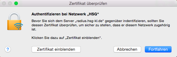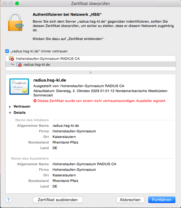 Bei Zertifikat überprüfen "Fortfahren" wählen, vorher man kann sich auch die Details anzeigen lassen.